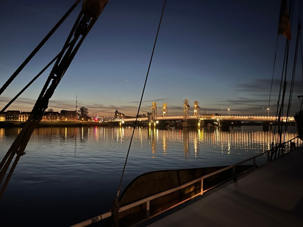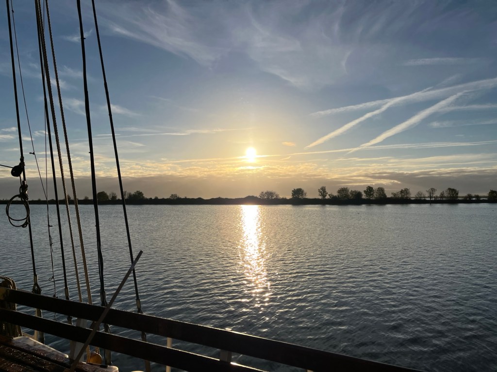 Unser letzter Tag: strahlend blauer Himmel beim Aufbruch und dann fast den ganzen Tag über auf dem Weg nach Kampen. Unter Klappbrücken hindurch ging es mit chilligem Wind zu unserem letzten Ankerplatz. Wir sind echt schon richtige Profis im Segel auspacken, hochziehen, in den Wind stellen, runterholen und wieder einpacken. Unter einer großen Klappbrücke sind wir sogar unter Segel durch.