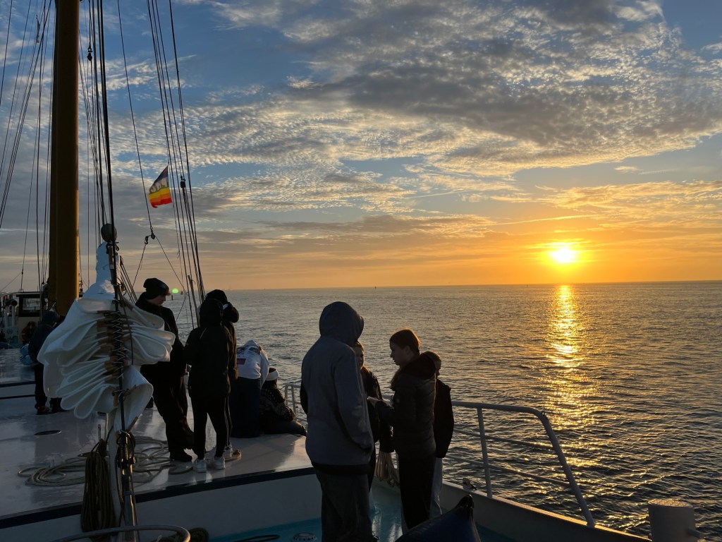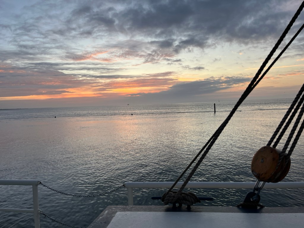 Endlich! Mit bis zu 10 Knoten, was wahrscheinlich ein neuer Erbacher Konfi-Rekord ist, sind wir unterwegs nach Terschelling – und das wo wir gerade erst von Simon die Knoten und alles weitere zum Segeln gelernt haben. Die Nordsee gibt alles um sich uns in den Weg zu stellen, aber selbst meterhohe Wellen (also wörtlich genommen 🥳) können uns nicht aufhalten. Fast hätten wir allerdings eine Extra-Runde für M. drehen müssen – mehr wollen wir da gar nicht sagen 🛟 😉